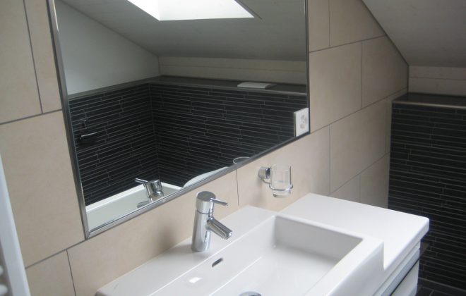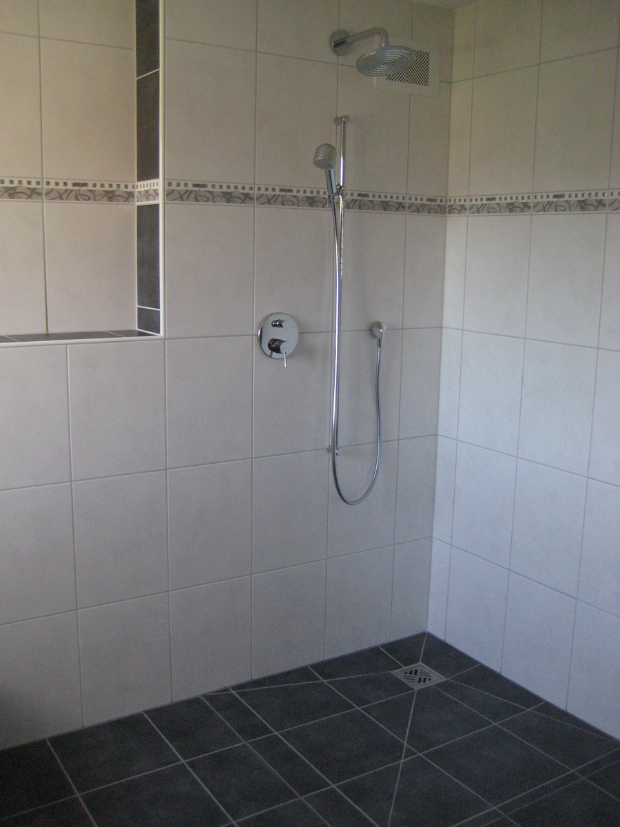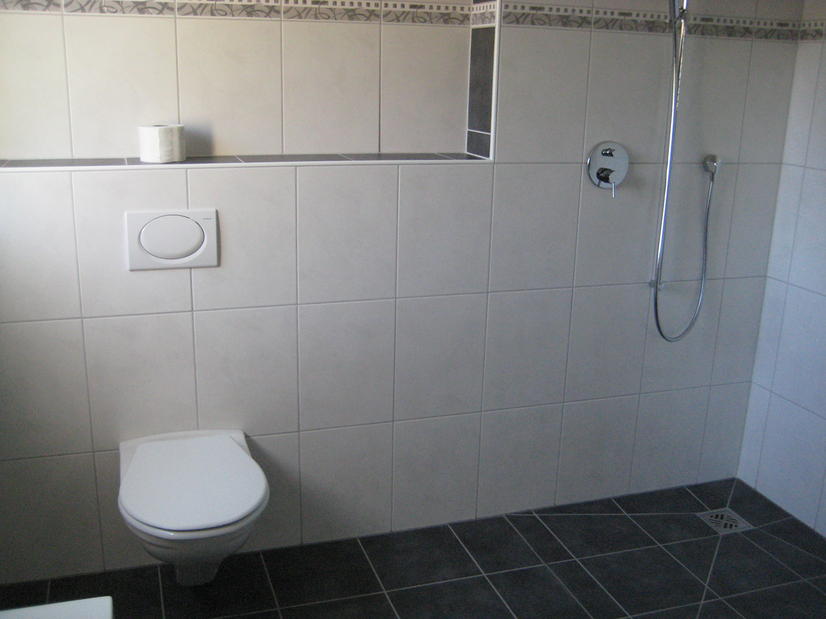 Plattenarbeiten Boden und Wand, Toilette aufmauern und begehbare Dusche mit Chromstahl-Ablagen für Duschmittel. Das Mosaik…