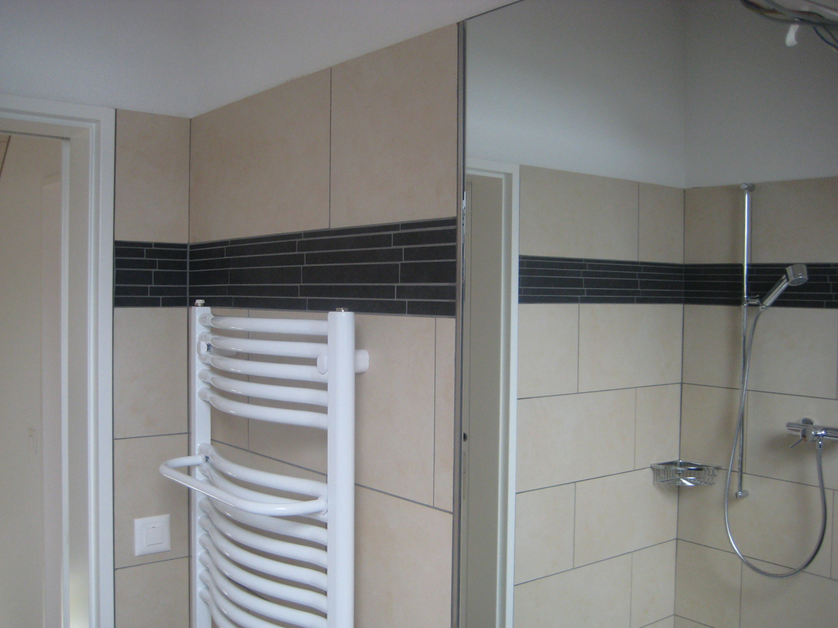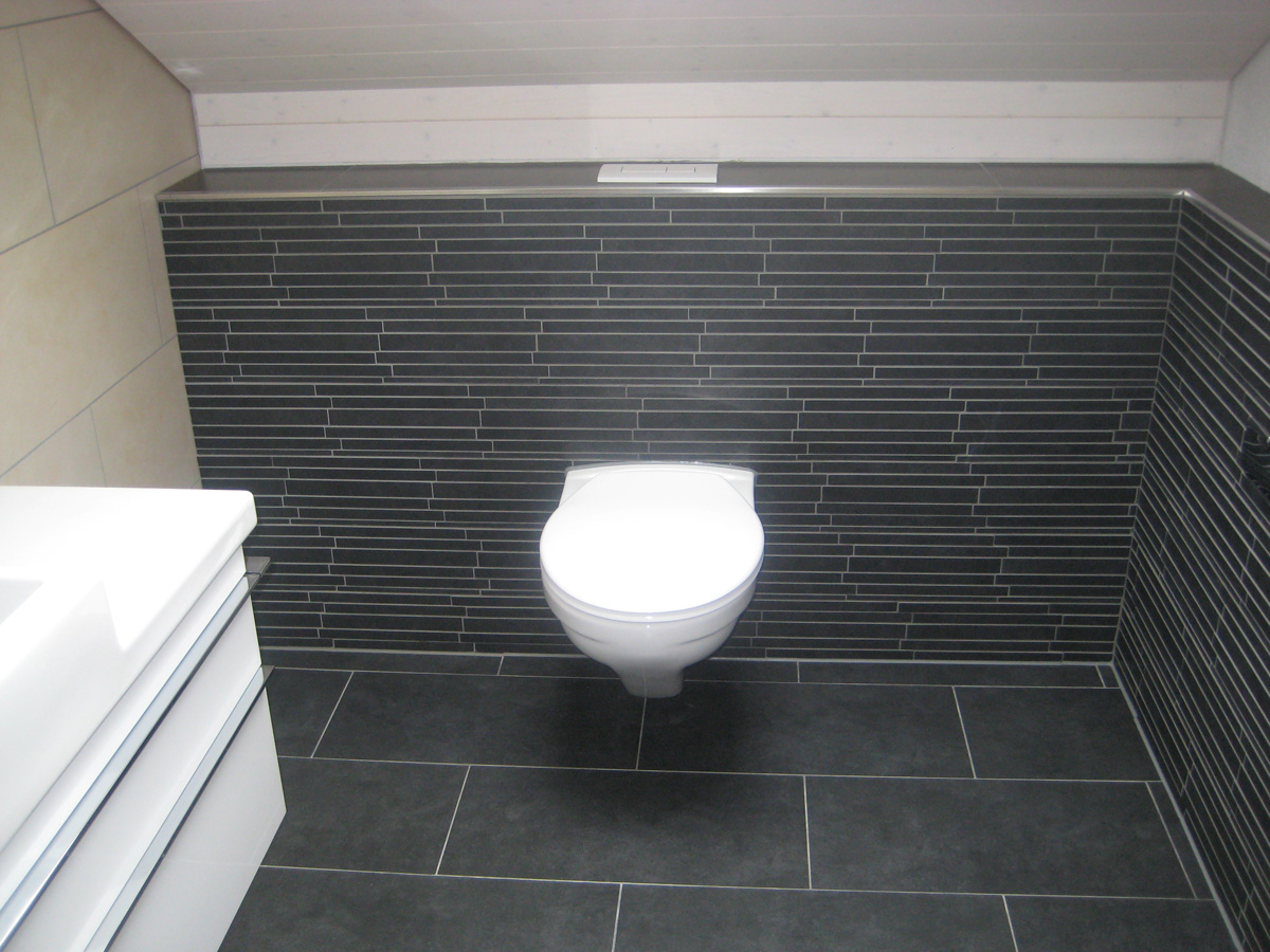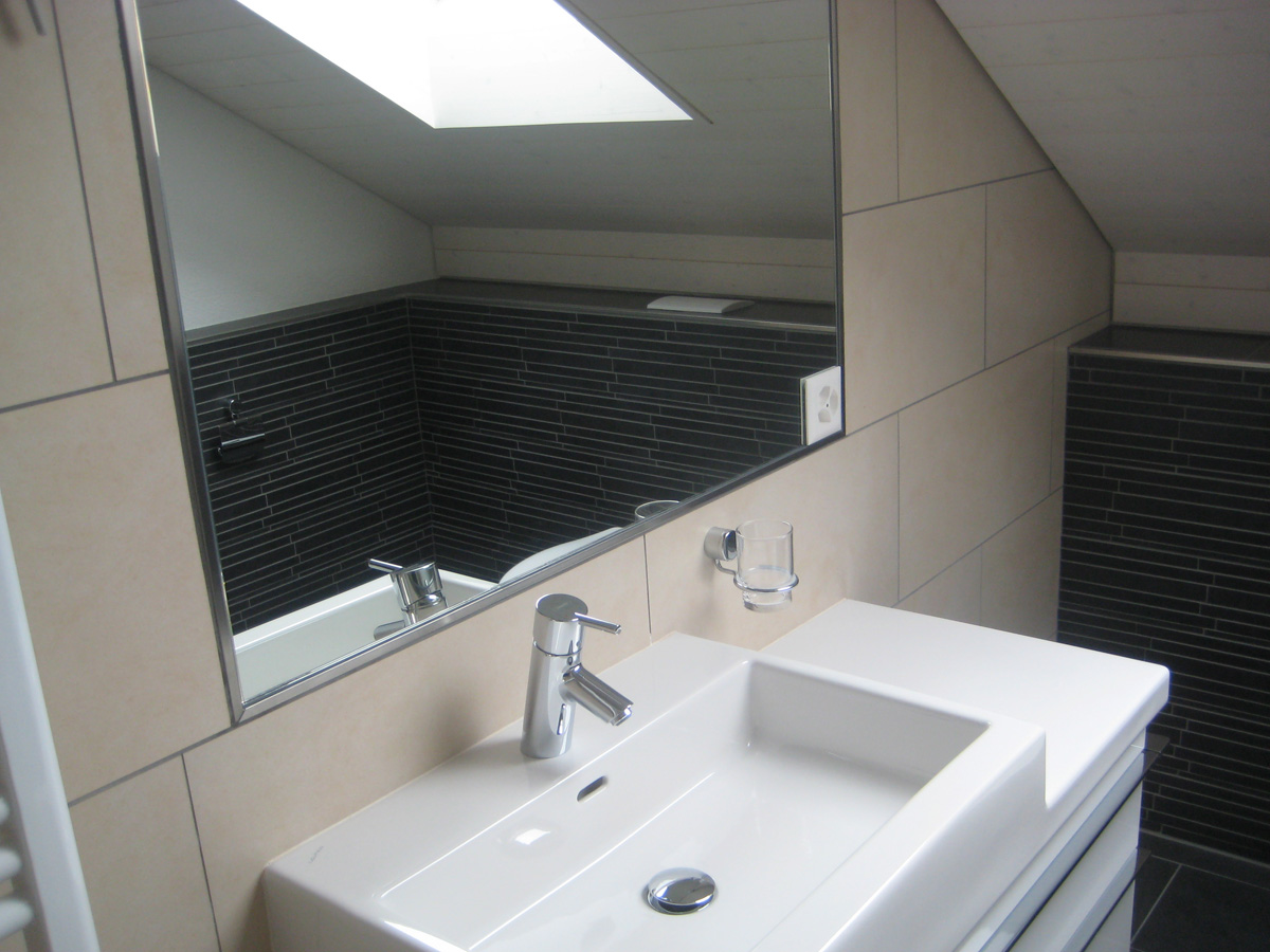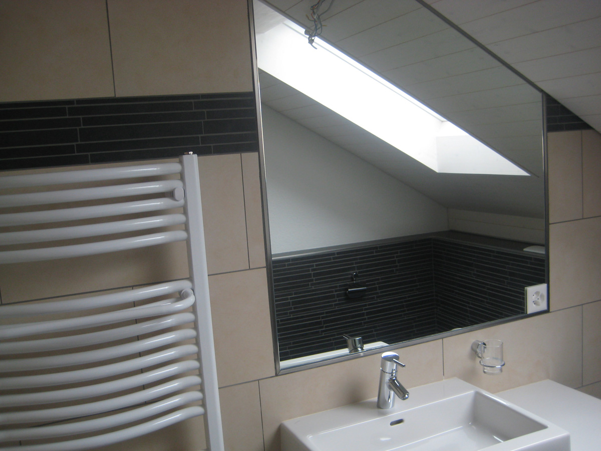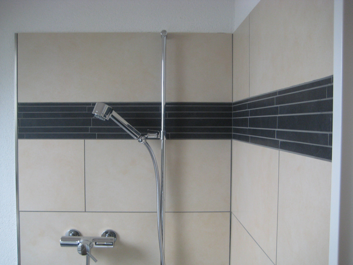Das Objekt hat eine Dachschräge. Dadurch konnte die Dusche nur in einer Ecke eingebaut werden. Die Duschwanne wurde so tief wie möglich angesetzt. Das ganze Bad ist durchgängig mit Mosaikplatten verziert und ergibt dadurch ein einheitliches Bild.