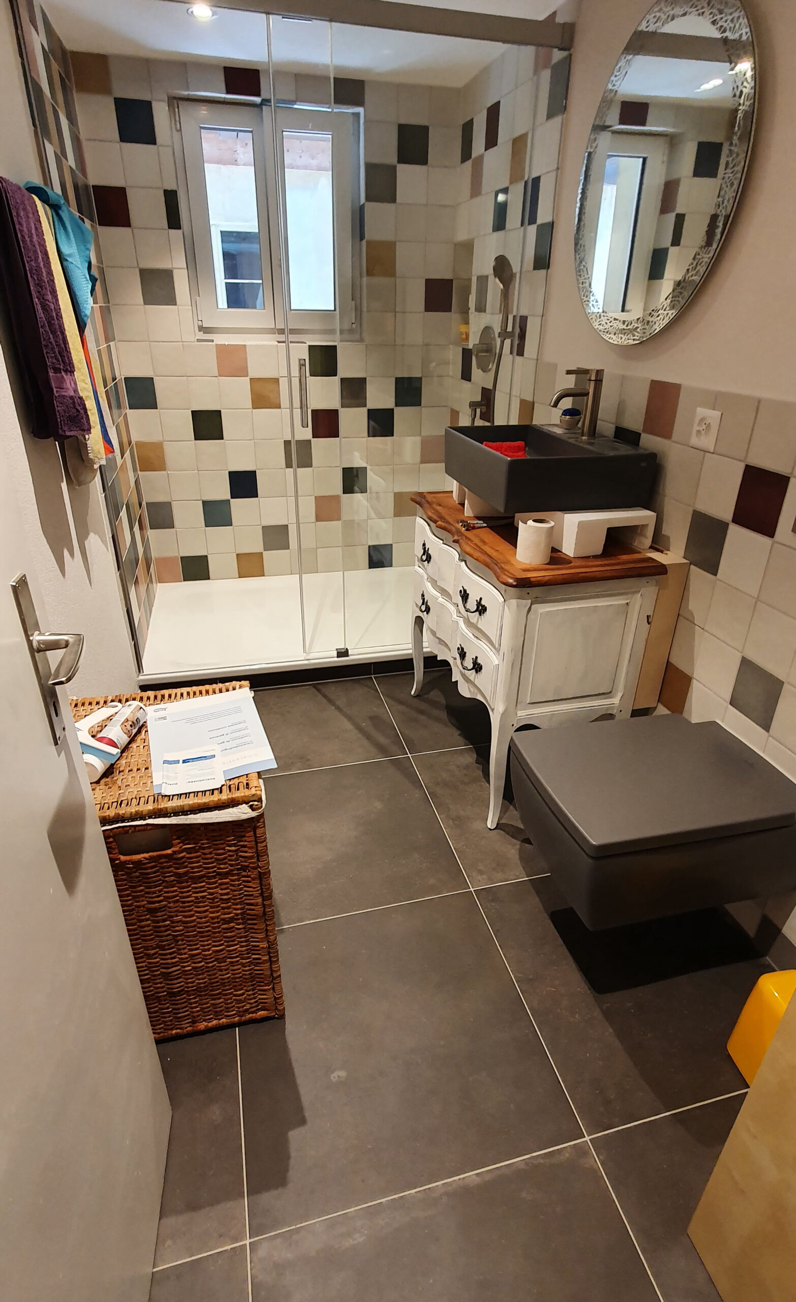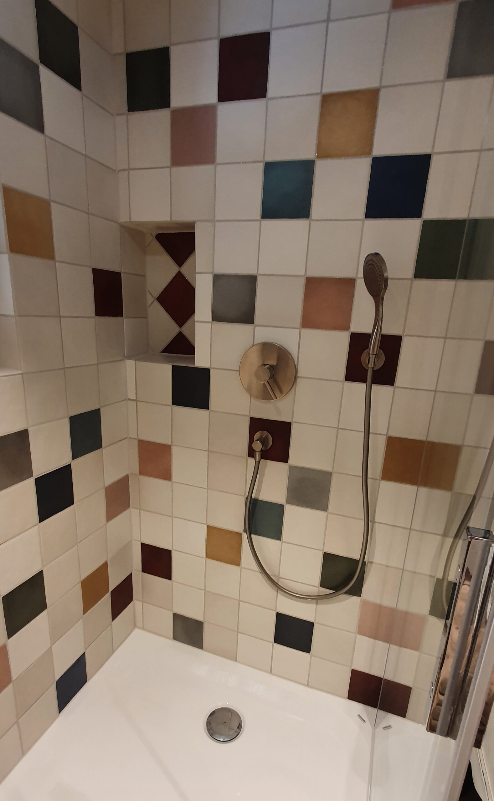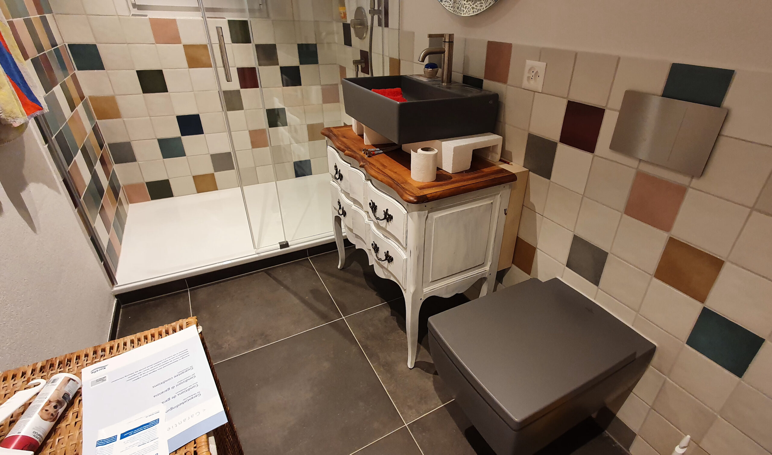 Die Badewanne wurde schräg in die Ecke gebaut. Dadurch konnte man in die Ecke eine…