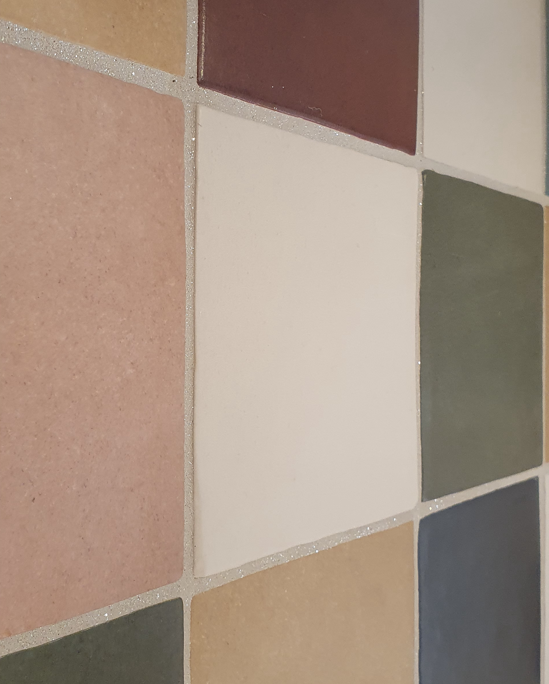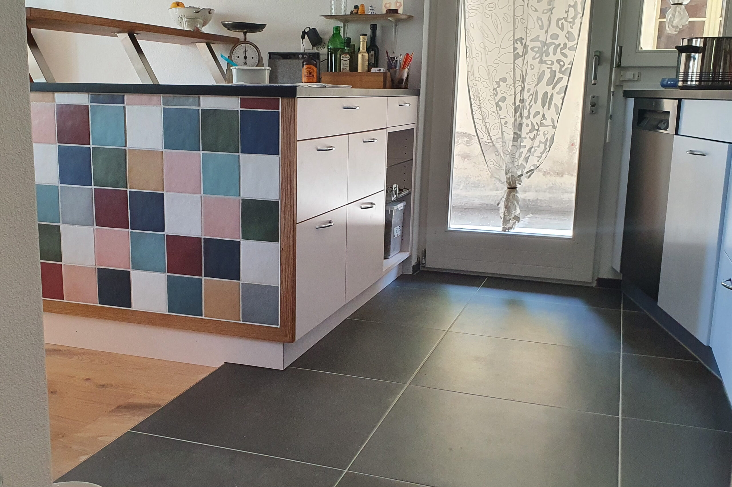 Boden vollständig neu plätteln inkl. Treppenabgang in die Werkstatt/Büro, Wandverzierung, im Tresen die selben Platten…