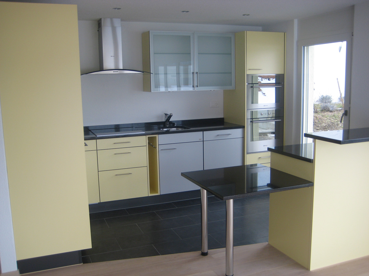Der Übergang vom Wohnbereich in die Küche soll von Ecke zu Ecke geschnitten sein. Die Fliesen wurden bündig mit der Kücheninstallation ausgerichtet. Die Fuge wurde in Holzfarbe gewählt.