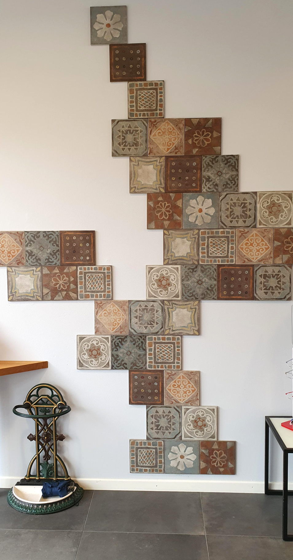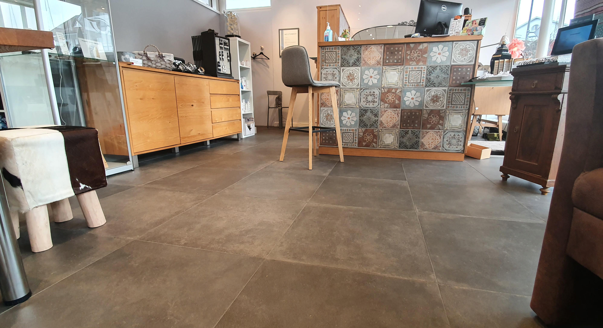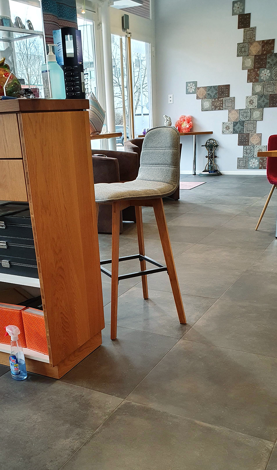 Boden vollständig neu plätteln inkl. Treppenabgang in die Werkstatt/Büro, Wandverzierung, im Tresen die selben Platten wie bei der Wandverzierung integrieren.