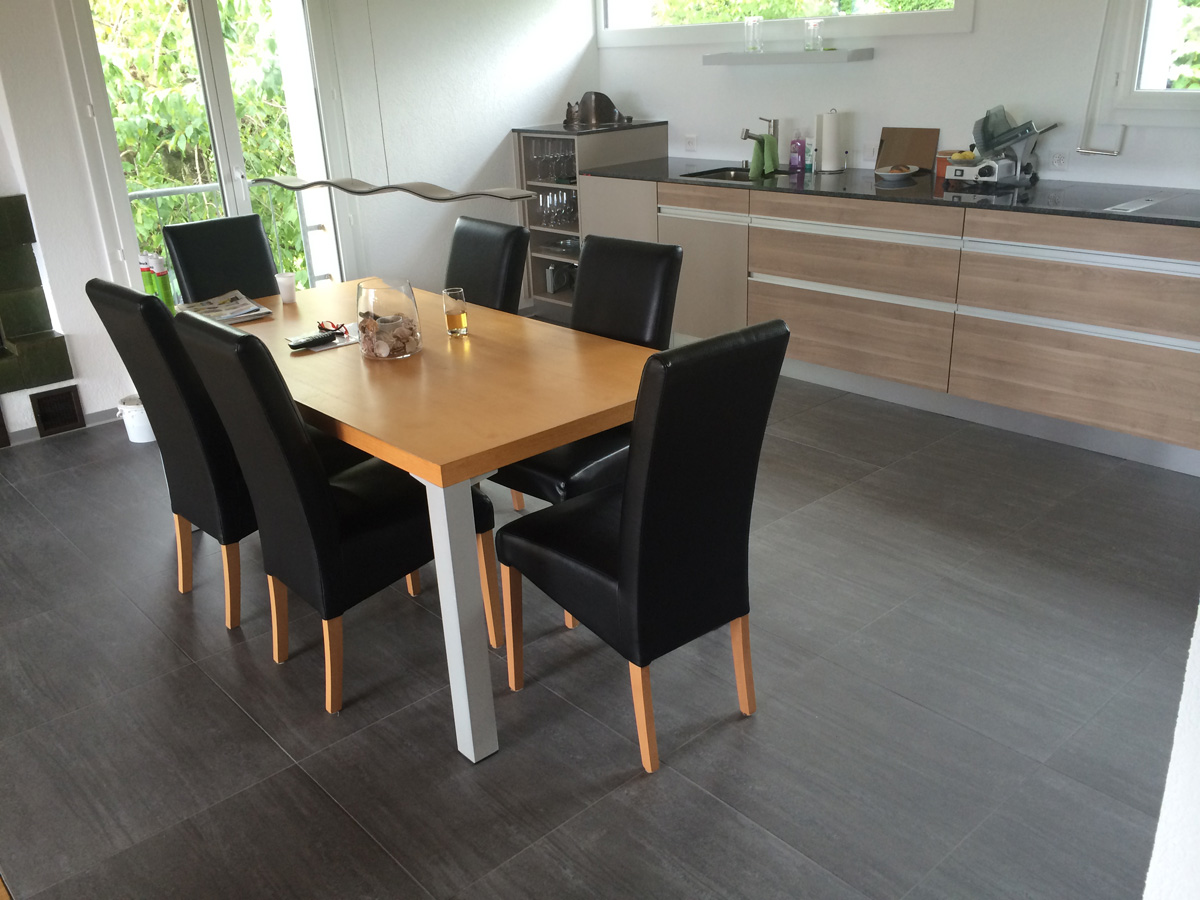 Der Boden muss angenehm sein, damit man am Esstisch gemütlich sitzen kann. Die Bodenplatten müssen aber auch robust genug für eine Küche sein.